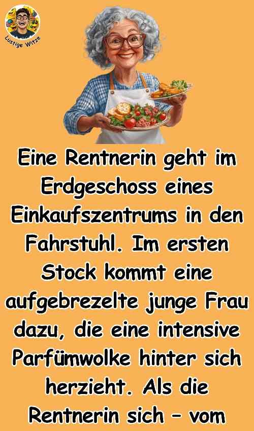 Eine Rentnerin geht im Erdgeschoss eines Einkaufszentrums in den Fahrstuhl. Im ersten Stock kommt eine aufgebrezelte junge Frau dazu, die eine intensive Parfümwolke hinter sich herzieht. Als die Rentnerin sich – vom Duft überwältigt – Luft zufächert, rümpft die Frau empört die Nase und sagt: „’J’adore absolu’ von Dior – 50 ml, 70 Euro.“