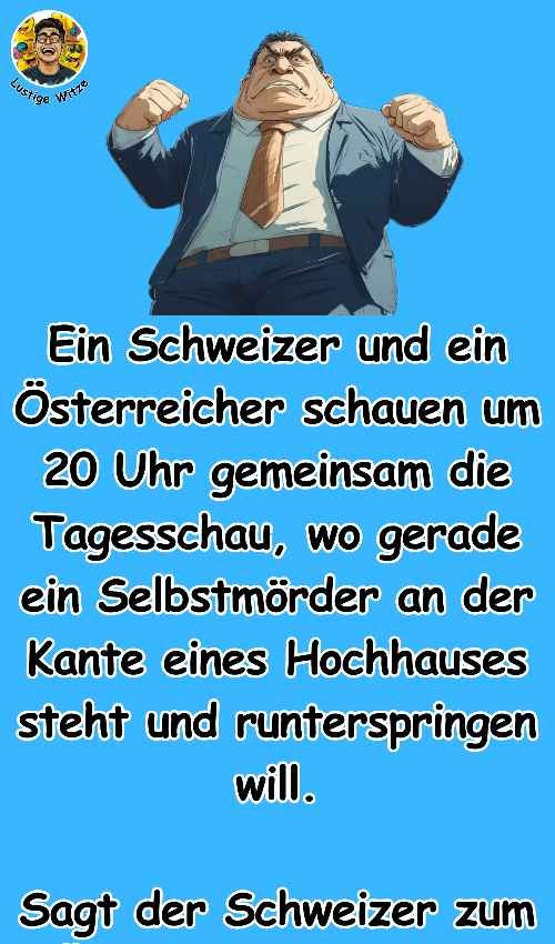 Ein Schweizer und ein Österreicher schauen um 20 Uhr gemeinsam die Tagesschau, wo gerade ein Selbstmörder an der Kante eines Hochhauses steht und runterspringen will.